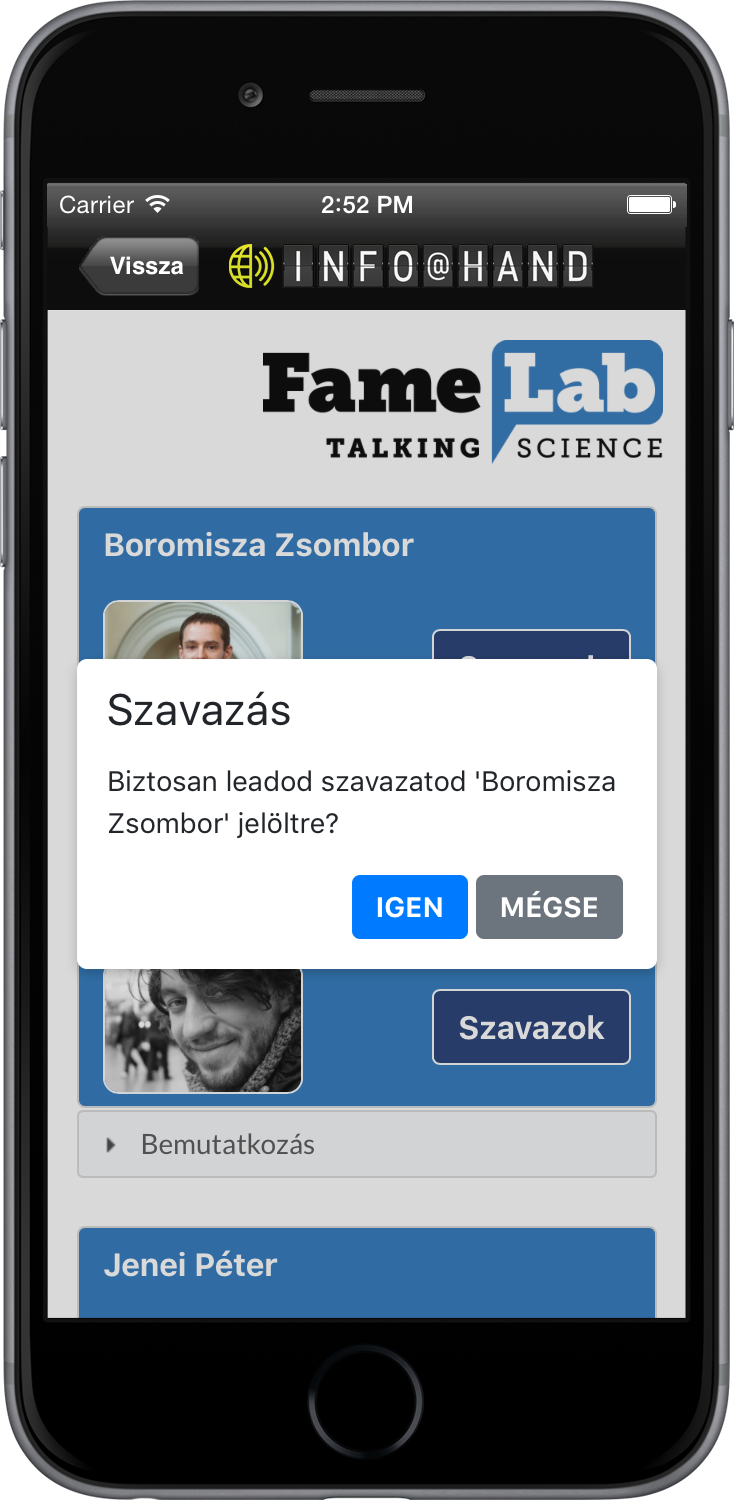 A magyar FameLab-en elsőként a verseny részleteit az INFO@HAND FameLab okostelefonos alkalmazás segítségével is lehetett követni. Az alkalmazáson keresztül a közönség szavazhatott a kedvenc előadójára is a helyszínen.